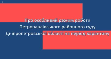 Враховуючи вказану постанову, а також з метою убезпечити населення України від поширення гострих респіраторних захворювань та коронавірусу COVID-19, який віднесено до особливо небезпечних інфекційних хвороб, на період з 16 березня до 03 квітня 2020 року у Петропавлівському районному суді Дніпропетровської області встановлено особливий режим роботи, внаслідок чого суд звертається до громадян, які є учасниками судових процесів, з проханням утриматися від участі у судових засіданнях, якщо слухання не передбачають обов'язкової присутності учасників сторін, а також роз’яснює про можливість відкладення розгляду справ у зв’язку із карантинними заходами та можливість розгляду справ в режимі відеоконференції.